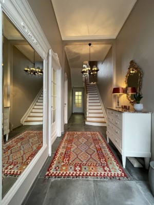 • Living, 3 pièces en enfilade: (3.91x8.79)+(3.21x3.04) 44.13m², parquet massif, poêle à bois, moulures aux murs, cheminée en marbre, accès sur la terrasse