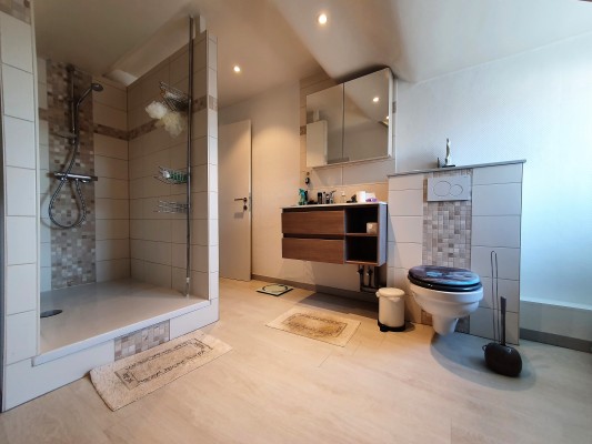 - Salle de douches: (1.40x1.04)+(2.67x2.90) 9.24m², parquet flottant, douche italienne, w.c., meuble lavabo avec miroir éclairé, meubles de rangement