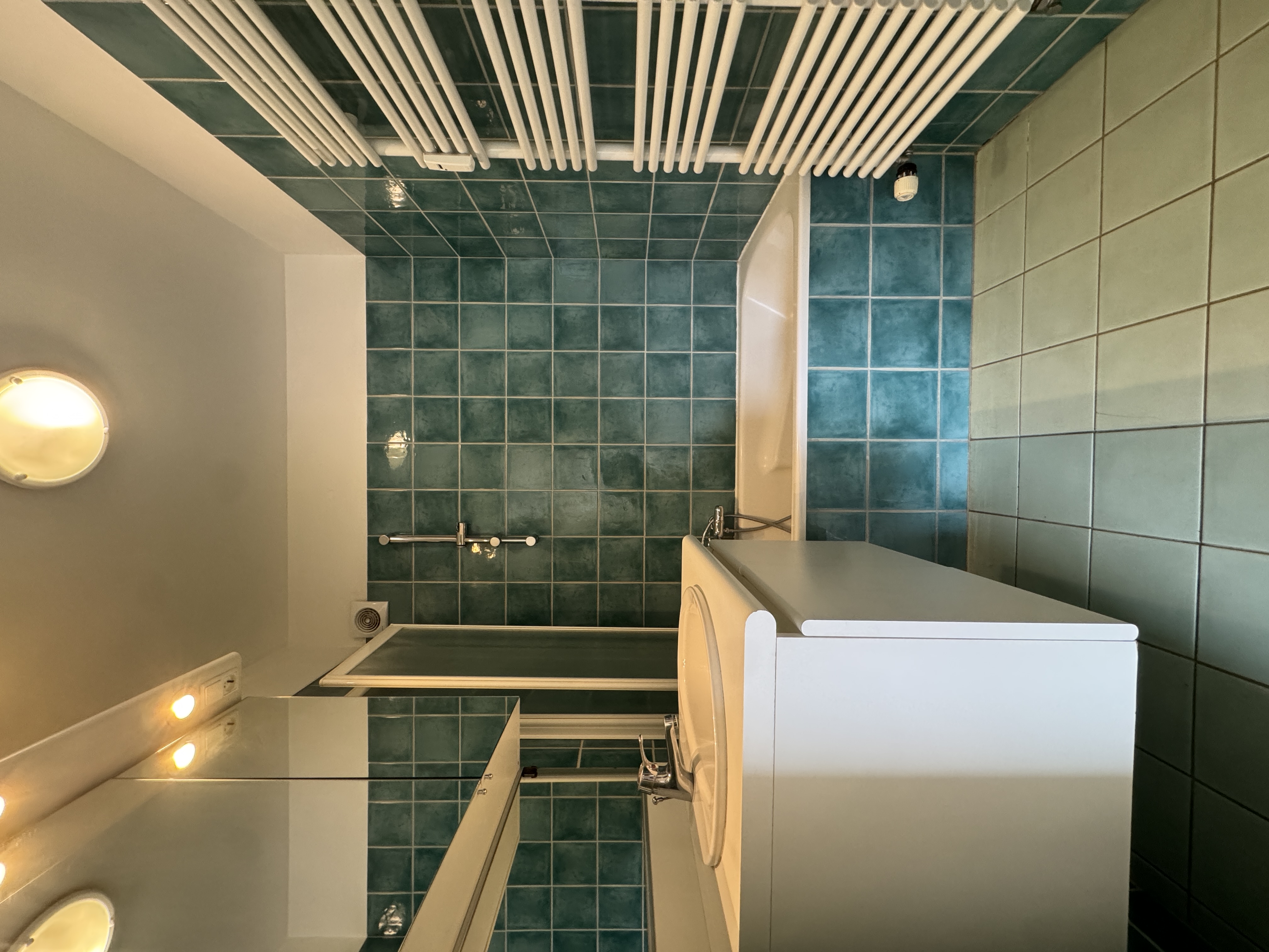 - Salle de bains: (2,21x1,70) 3,75m2 carrelage, baignoire, meuble lavabo avec armoire pharmacie éclairée, colonne, sèche serviettes