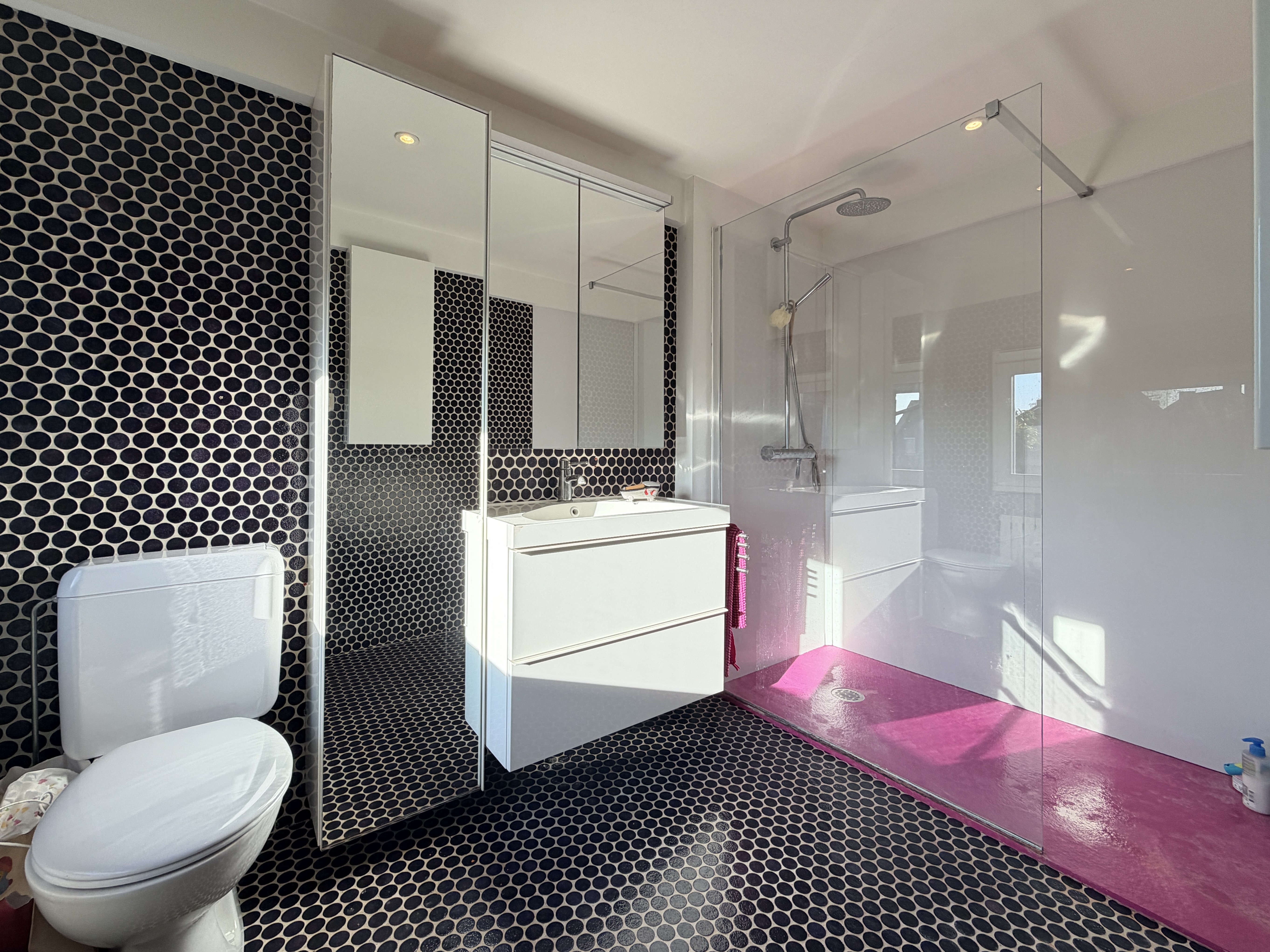 - Salle de douches : (1.93x3.18) 6.15m², carrelage, wc, meuble lavabo avec colonnes, douche avec receveur plat et paroi vitrée
