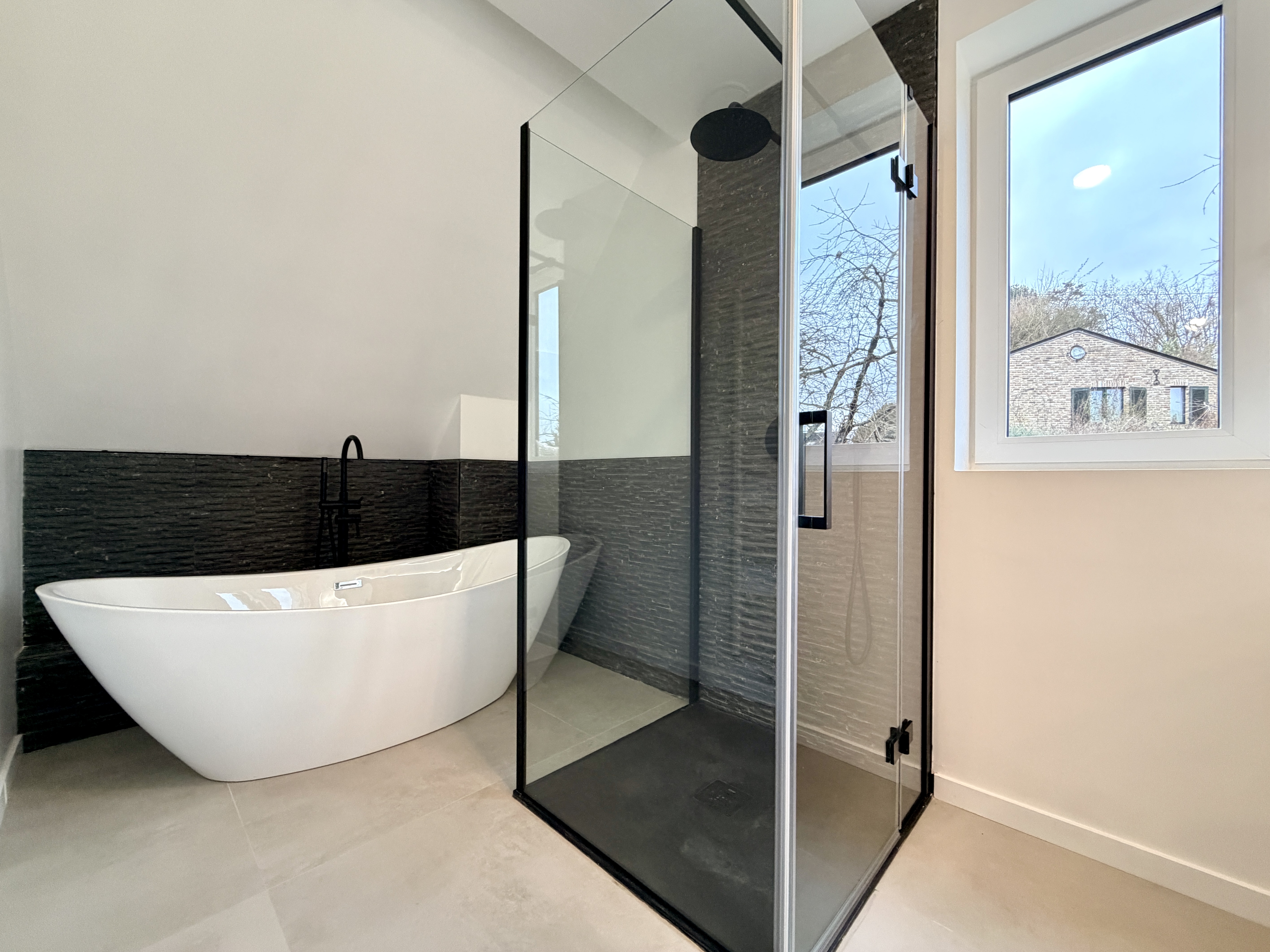 - Salle de douches: (3.94x2.11) 8.30m2, carrelage, baignoire îlot, douche à l’italienne, robinetterie encastrée, wc suspendu Geberit, meuble double vasque avec robinetterie encastrée, miroir rétro éclairé